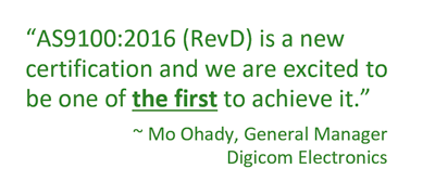 Digicom Electronics announces it has received aerospace cerfication AS9100:2016 (RevD) & ISO 9001:2015, and is one of the first EMS companies to achieve it. Learn more