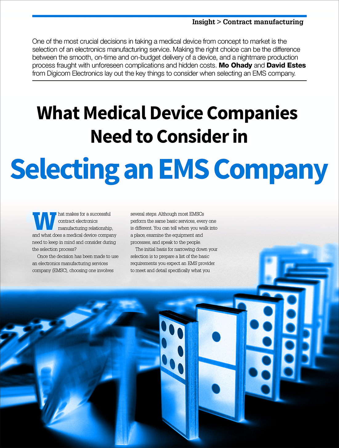 October 9, 2014 - Digicom Electronics, Inc., a technology and quality driven electronics manufacturing services (EMS) company, announces that the white paper, What Medical Device Companies Need to Consider in Selecting an EMS Company, is now available on the Digicom Electronics website at www.digicom.org/pdf/selecting-ems-company.pdf. The article discusses the factors that contribute to a successful contract electronics manufacturing relationship and the things a medical device company needs to keep in mind and consider during the selection process. The article details the steps to take in selecting the contract manufacturer best suited to handle the design, prototyping, material selection and purchasing, manufacturing, test, process validation, shipping and logistics, and/or other special needs of a medical device company. Information ranges from checking for certifications such as ISO 13485:2016 Quality Management system and quality system regulation 21 CFR 820, to the board cleaning processes used, to handling process validation.